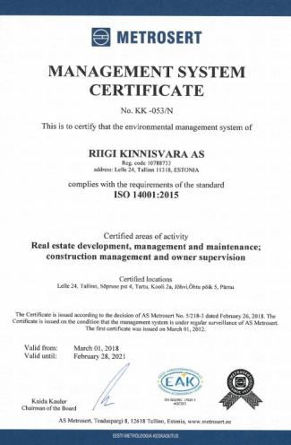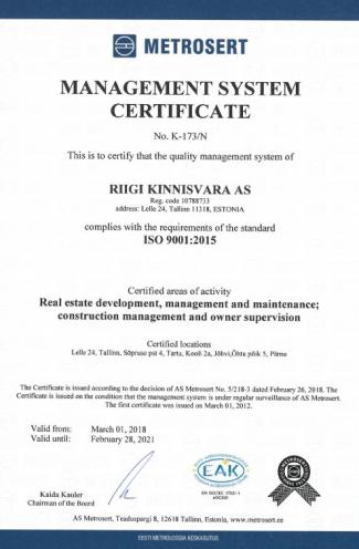 On 13 November 2007, Riigi Kinnisvara AS was issued the first IS0 9001:2000 quality management system certificate.