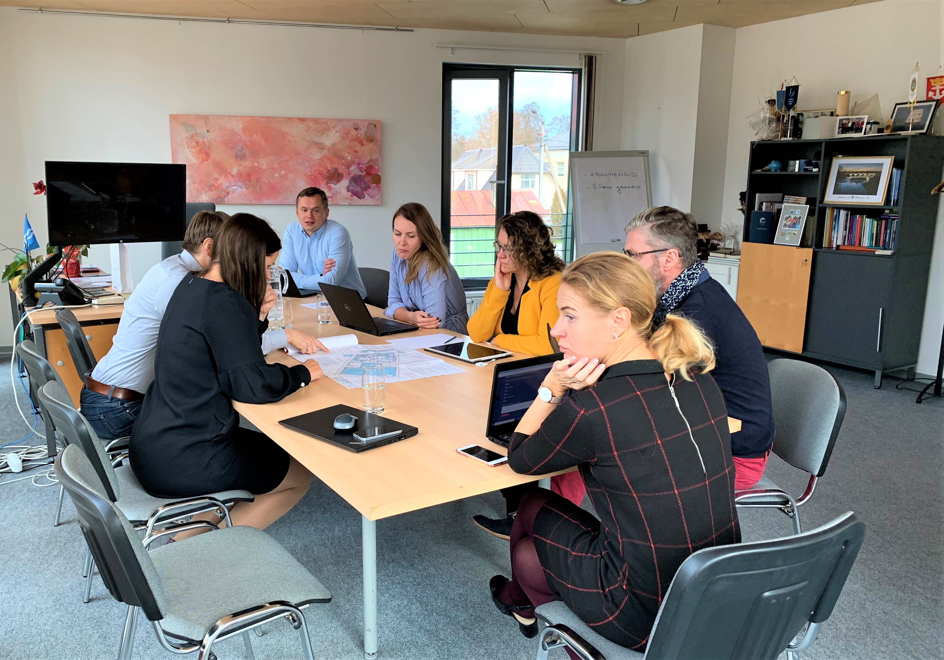 Pildil Hiiumaa riigimaja töögrupp: Riigi Kinnisvarast Pertti Neero ja Kärt Vabrit, Hiiumaa vallast Lauri Preimann, Kaire Nõmm, Monika Pihlak, Triin Masing ning volikogust Aivar Viidik.